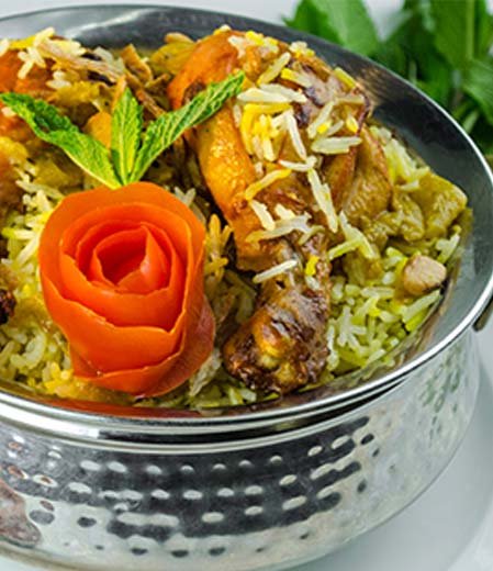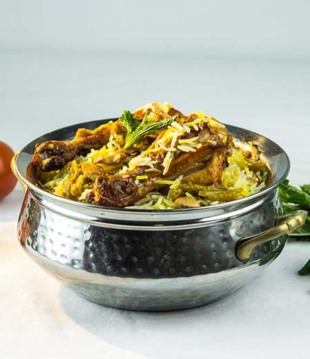 Prepared with marinated chicken cooked in a blend of yogurt, fried onions, mint, and freshly ground spices, the dish is layered with fragrant basmati rice and slow-cooked using the traditional dum method. The result is a flavorful, aromatic biriyani that perfectly balances spice, richness, and texture, reflecting India’s royal culinary heritage.