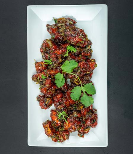 In the dry version, boneless chicken pieces are marinated in a mixture of cornflour, soy sauce, and ginger-garlic paste, then deep-fried and tossed with sautéed onions, bell peppers, green chilies, and a light coating of sauce—ideal as a starter. The gravy version includes a thicker, tangy-sweet sauce with added water or stock, making it perfect to pair with fried rice or noodles.