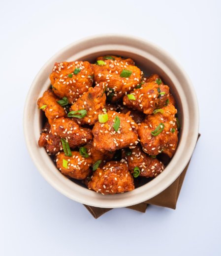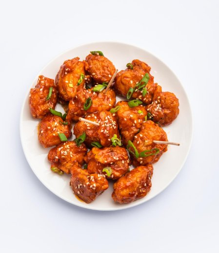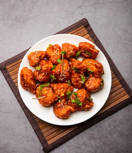 Boneless chicken is marinated in a mixture of cornflour, soy sauce, garlic, and ginger, then deep-fried to a crispy golden brown. The fried pieces are then tossed in a spicy, tangy sauce made with chili sauce, soy sauce, vinegar, garlic, green chilies, and sautéed onions and bell peppers. Depending on the preparation, Chicken Manchurian may be served as a dry starter or with a thick gravy ideal for pairing with fried rice or noodles.