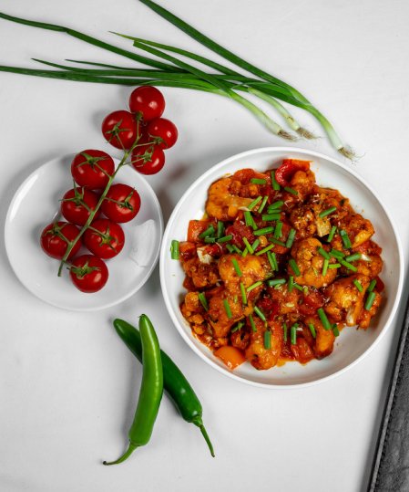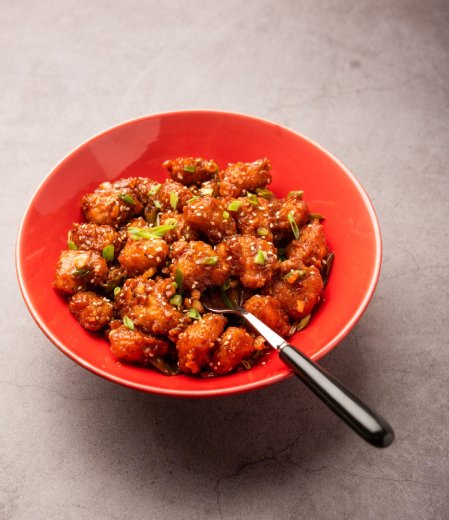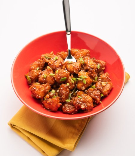 Cauliflower florets are battered with cornflour, rice flour, and chili powder, then deep-fried until golden and crunchy. They are then stir-fried with garlic, green chilies, ginger, onions, and bell peppers in a wok over high flame. A mix of soy sauce, vinegar, and red chili sauce coats the gobi, creating a dry but glossy finish, often garnished with spring onions.