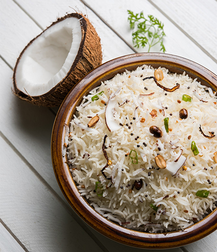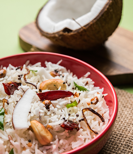 Coconut Rice is a fragrant South Indian rice dish made with freshly grated coconut, tempered spices, and cooked rice. Often prepared during festivals, temple offerings, or as a lunchbox favorite, it is especially popular across Tamil Nadu and Kerala for its simplicity and rich coconut flavor.
