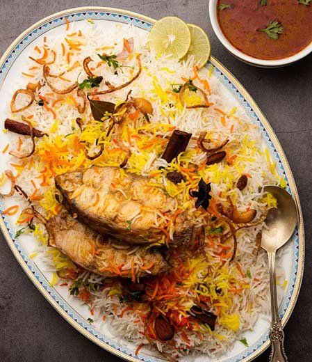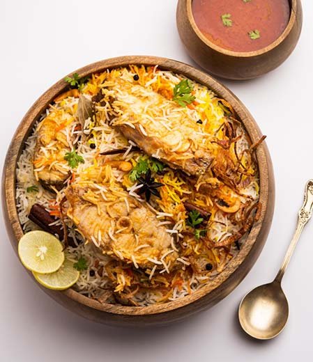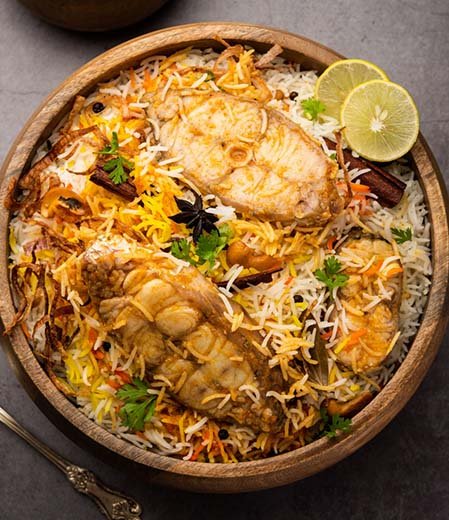 The fish—usually seer, kingfish, or pomfret—is marinated with turmeric, chili powder, and lemon juice, then lightly fried or cooked in a spiced onion-tomato masala with green chilies, ginger-garlic paste, and garam masala. Fragrant basmati rice is cooked separately with whole spices and layered with the fish, fried onions, mint, and coriander. The biryani is finished using dum or gentle steaming for perfect fusion of flavors.