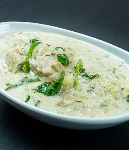 Bone-in goat pieces are slow-cooked with onions, ginger, garlic, green chilies, and whole spices like cardamom, cinnamon, and cloves. The base is enriched with thick coconut milk, which gives the stew its creamy consistency and gentle sweetness. A final tempering of curry leaves and coconut oil adds a distinctly Kerala aroma.