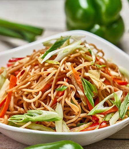 Stir-fried noodles with tender chicken, vegetables, and soy seasoning — a popular Indo-Chinese classic.