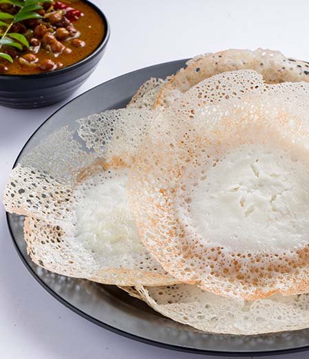 Made from a batter of raw rice, cooked rice, coconut, cumin, and shallots, kallappam is fermented and poured thick onto a hot griddle, forming soft, spongy pancakes with slightly crisp edges. Mildly sweet and aromatic, kallappam pairs well with meat curries like chicken stew, mutton curry, or spicy fish preparations.