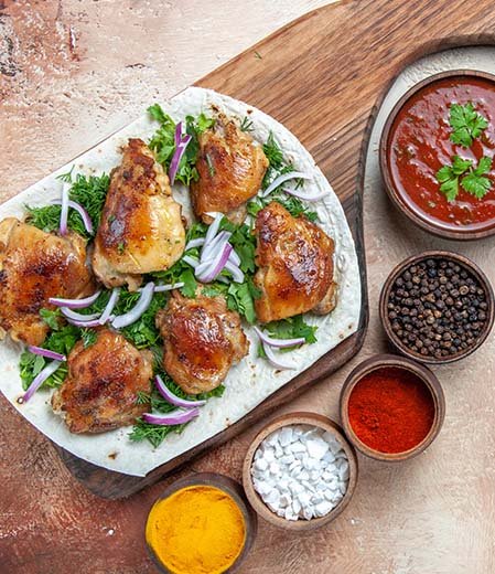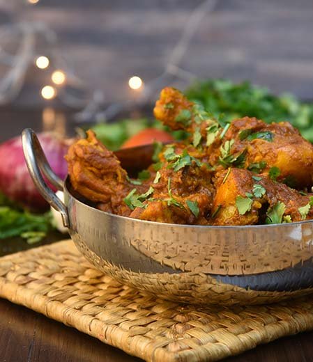 This dish features bone-in or boneless chicken pieces cooked with a roasted spice blend made from fennel, black pepper, coriander, and dry red chilies. Onions, garlic, curry leaves, and crushed ginger form the base, which is sautéed in sesame or groundnut oil until caramelized. The chicken is slow-roasted in this masala until it turns dark, rich, and aromatic with minimal moisture.