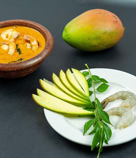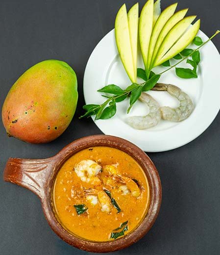 The curry features prawns simmered in a coconut-based gravy with sliced green mango, turmeric, green chilies, and curry leaves. The raw mango imparts a natural sourness that complements the sweetness of the prawns and the richness of the ground coconut. Often finished with a tempering of mustard seeds and coconut oil, the dish carries deep coastal aromas and a naturally creamy texture.