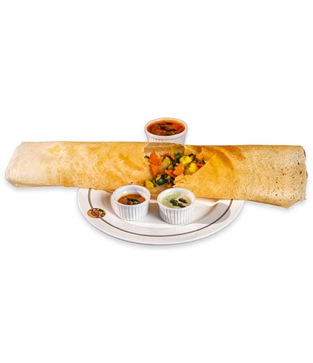 The dosa batter—made from fermented rice and urad dal—is spread thin and topped with a vibrant mix of finely chopped carrots, beans, onions, capsicum, and cabbage sautéed in mild South Indian spices. The dosa is then cooked until golden and crispy, releasing a rich aroma that pairs perfectly with coconut chutney and sambar.