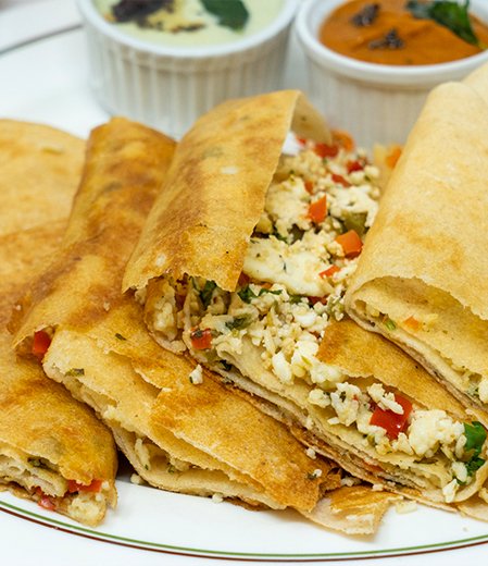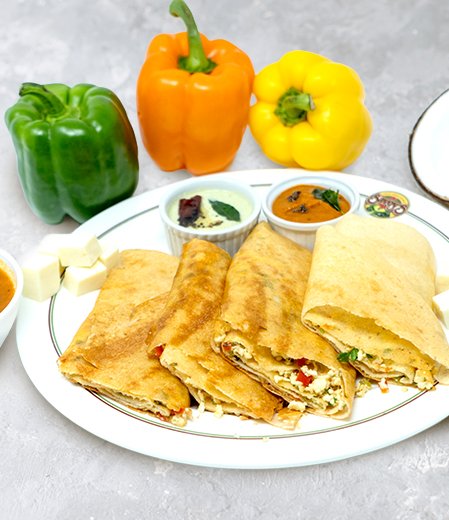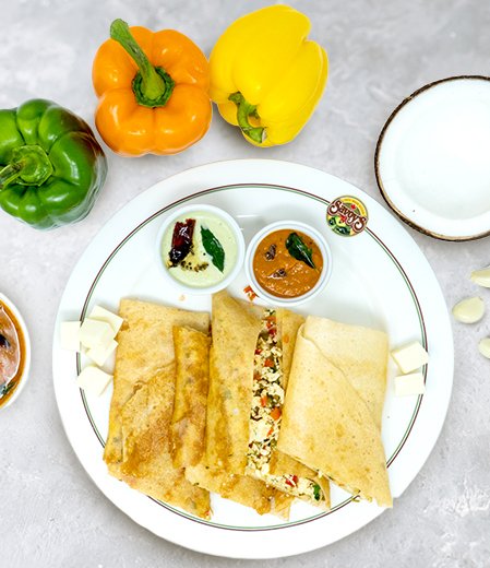 Paneer Masala Dosa is typically served with coconut chutney, tomato chutney, and sambar, offering a fusion experience that appeals to both traditional and modern palates in cities like Chennai, Coimbatore, and Bengaluru, as well as among South Indian families in Mississauga, Surrey, and Brampton.