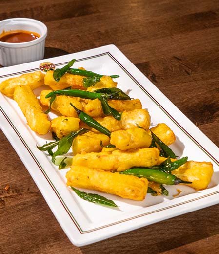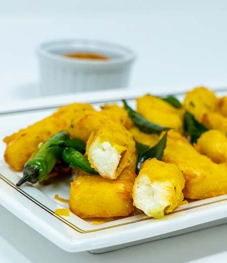 The paneer is cut into cubes or stuffed with green chutney, then coated in a spiced batter made with besan, rice flour, ajwain, red chili powder, and turmeric. It is deep-fried until the crust turns golden and crisp, while the inside remains soft and creamy. Some variations include a double-fry method for extra crunch or a sprinkle of chaat masala on top.