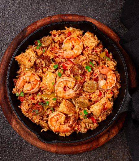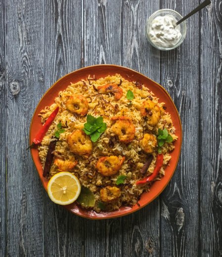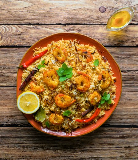 Aromatic basmati rice layered with spiced prawns, herbs, and fried onions—rich, coastal, and full of flavor.